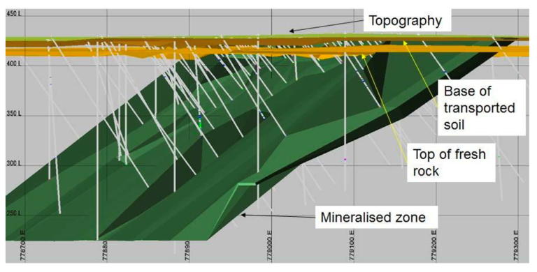 The East Block is situated the eastern part of the ML Block and extends over an area of 35ha. It is a N-S trending block, which is separated from the west Block by a NE-SW trending major dolerite dyke. Barring a few outcrops in the block, this is largely concealed under a thick cover of soil and ancient mine rejects. This material, which is generally called as “Debris” is an admixture of soil with angular blocks, boulders, cobbles and pebbles of waste rocks ( scree/colluvium) and mineralized rock (quartz vein) which were discarded by the ancient miners. It attains a maximum thickness of about 4m along the ancient pit in East block. The thickness reduces to around 3m elsewhere in the East Block.