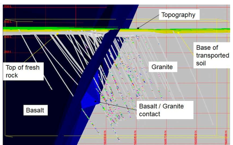 The West block trends NW-SE and covers an area of 32ha. West Block is located in the vicinity of the granite-supracrustal contact. Detailed mapping and observations from the drill cores indicate that the contact between supracrustal rocks and granite in curviplanar, with trend varying from WNW-ESE to NE-SW. The supracrustal rocks in the West Block are represented by metabasalt and metarhyolite. The contact between these two trends WNW-ESE. the dominant structure is the foliation, which trends N80W-S80E and steeply to the NNE. Gold mineralisation in the West Block occurs along WNW-ESE trending lodes in the metabasalt and along NNE-SSW trending shear zones within the granodiorite.