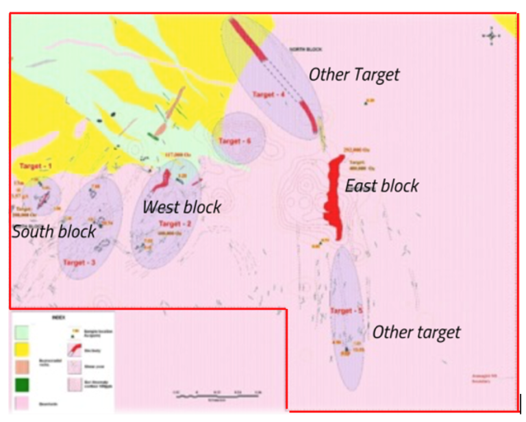 Based on the exploration carried out in the Jonnagiri ML, Geomysore has estimated the resource for East and West blocks. The Mineral Resource estimation and classification of Mineral Resources for the Jonnagiri Project was completed by Mr. Andrew Weeks who is a Fellow of the Australasian Institute of Mining and Metallurgy. Mr. Andrew Weeks has sufficient relevant experience to the style of mineralisation and type of deposit under consideration and to the activity for which he is undertaking to qualify as a Competent Person as defined in the JORC Code (2012 Edition). The following image indicated the various mineralized blocks within the Mining Lease area.