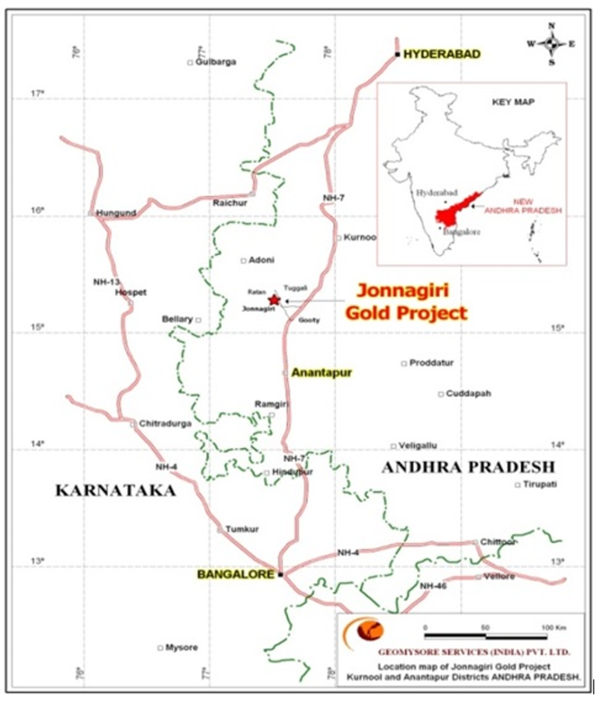 In West block, gold mineralization was established within silicified metabasalt over a strike length of 700 m. In East block, which is located 1.2km East-South-East of West block the major rock type belongs to granodiorite-tonalite suite, which shows intrusive relationship with the schist belt. The following map indicates the location of Jonnagiri Project in India.