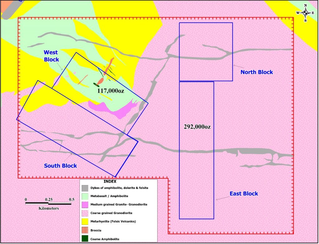 The West block trends NW-SE and covers an area of 32ha. West Block is located in the vicinity of the granite-supracrustal contact. Detailed mapping and observations from the drill cores indicate that the contact between supracrustal rocks and granite in curviplanar, with trend varying from WNW-ESE to NE-SW. The supracrustal rocks in the West Block are represented by metabasalt and metarhyolite. The contact between these two trends WNW-ESE. the dominant structure is the foliation, which trends N80W-S80E and steeply to the NNE. Gold mineralisation in the West Block occurs along WNW-ESE trending lodes in the metabasalt and along NNE-SSW trending shear zones within the granodiorite.